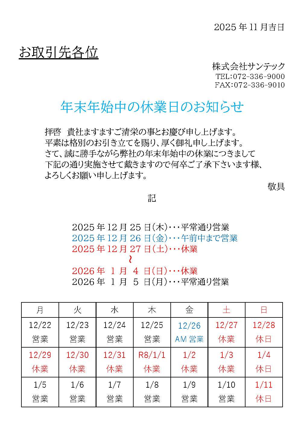 2025年度年末年始の休業日のお知らせ