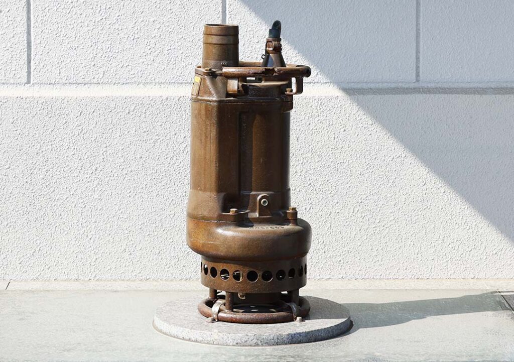 私たちサンテックは、まもなく創業60年という節目を迎えます。 当社の歩みは、水中ポンプのレンタル事業から始まりました。その原点を忘れず、未来へと受け継いでいきたいという想いから、2018年に竣工した新社屋には、創業時に初めて購入した水中ポンプを記念オブジェとして飾っています。