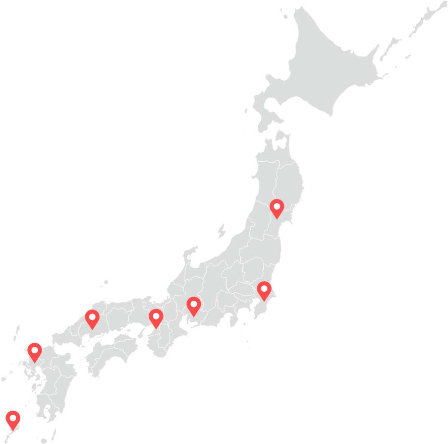 私たちは、東北仙台から沖縄まで国内8拠点を構え、全国の現場へ建設機械のレンタルを行っています。各拠点からお客様の現場へ、機動力あるレンタルサービスを実現しています。