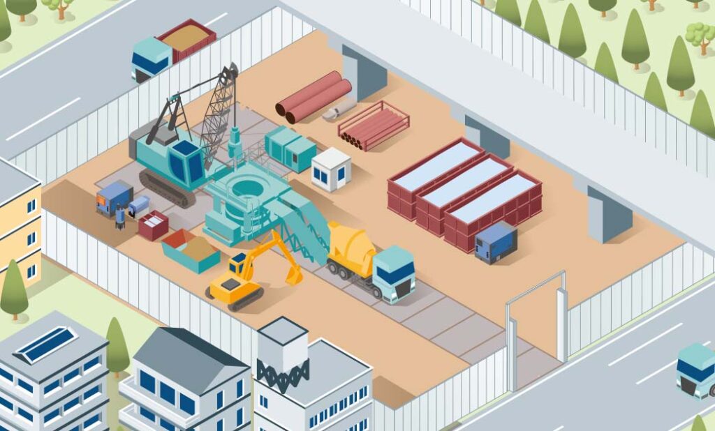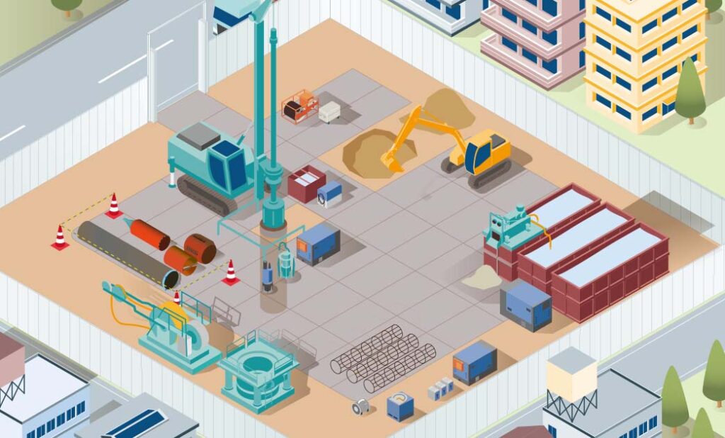 オールケーシング工法オールケーシング工法は、ケーシングチューブを掘削孔全長にわたり回転圧入しながら地盤を切削し、ケーシングチューブ内の土砂はハンマグラブにて掘削・排土。掘った穴に鉄筋を設置してコンクリートを流し込み、杭を築造する工法です。
