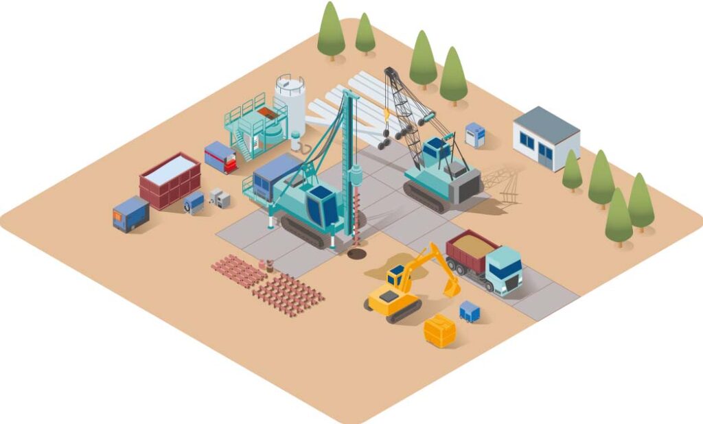 既製杭工法は、あらかじめ工場で作られた杭を現場へ運び、地中に挿入・埋設する工法です。杭は大きく2種類に分けられ、鉄筋コンクリートで作られたコンクリート杭と鋼管で作られた鋼管杭があります。